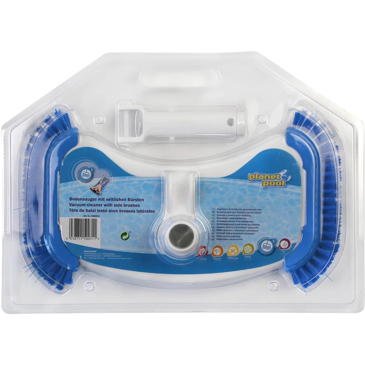 Der Bodensauger von der Marke Planet Pool mit seitlichen Bürsten zur Poolreinigung. Für 32 mm und 38 mm Schwimmbadschlauch geeignet. Passend mit allen handelsüblichen Teleskopstangen mit 32 mm Durchmesser.
