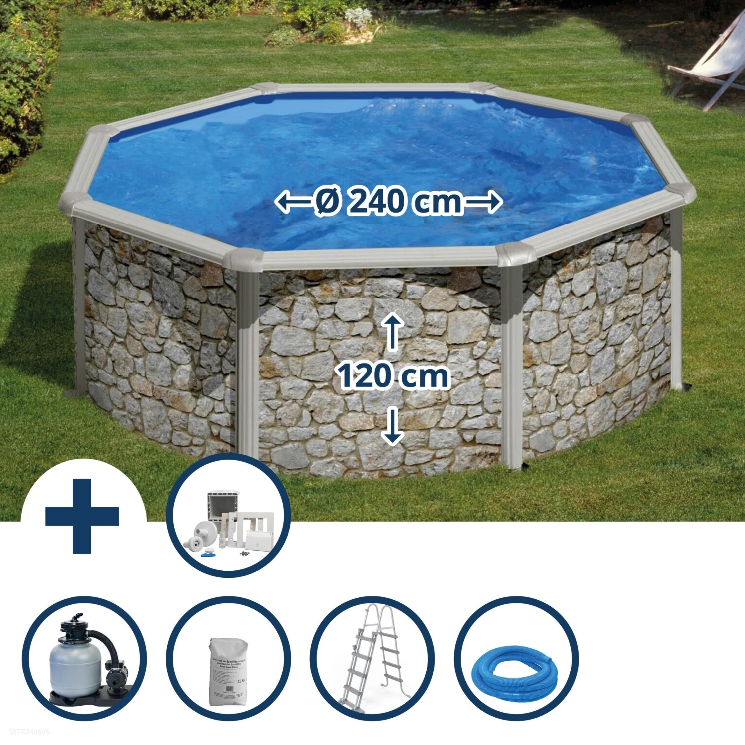 Dieser Rundformpool hat die Maße 240 x 120 cm und die Außenfarbe Steinoptik.