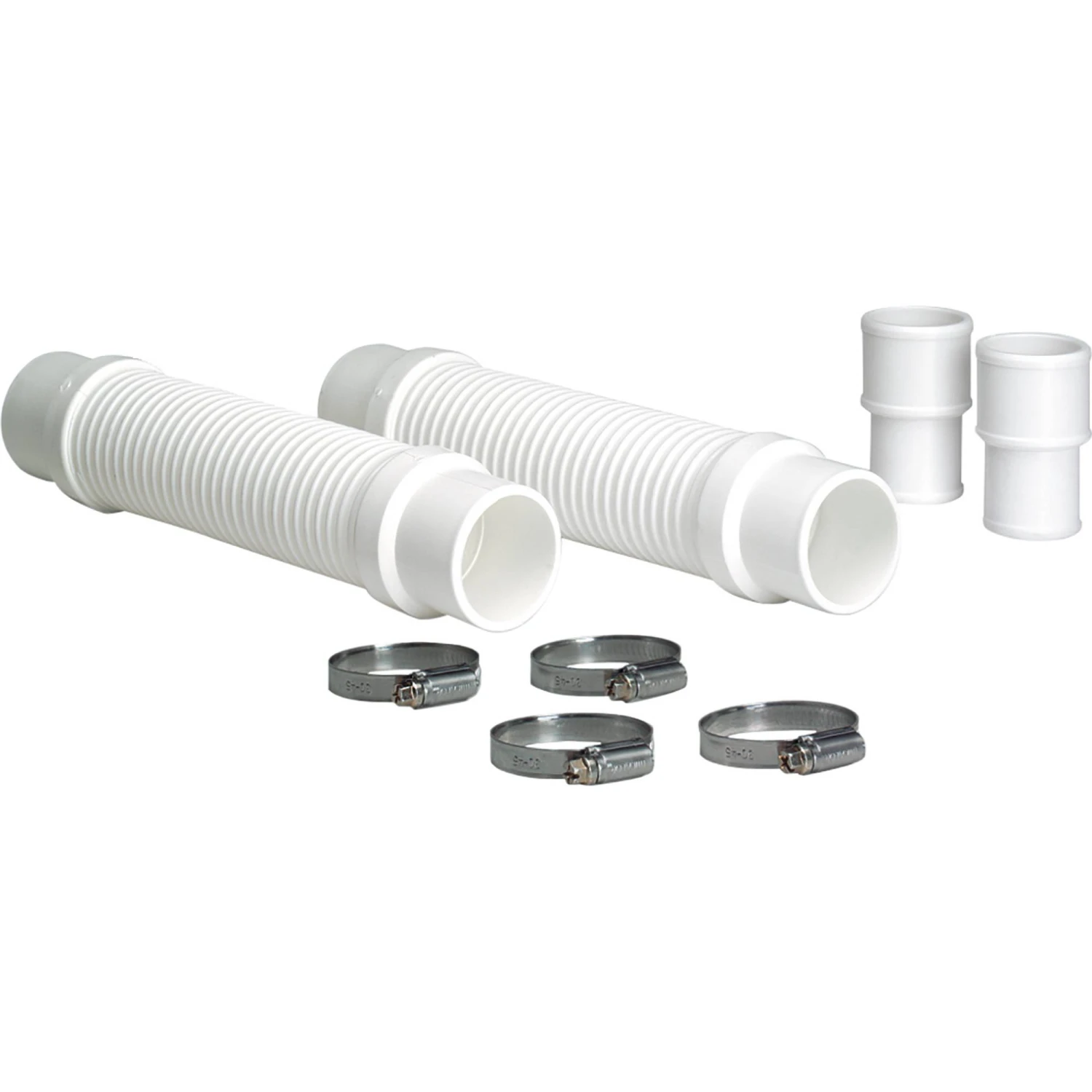 Schlauchanschlußset 32 mm auf 38 mm. Das Set besteht aus 2 kurzen chlorbeständigen Schlauchstücken mit 38 mm Durchmesser, 2 Schlauchtüllen 32 mm auf 38 mm und 4 Schlauchschellen zur Befestigung.