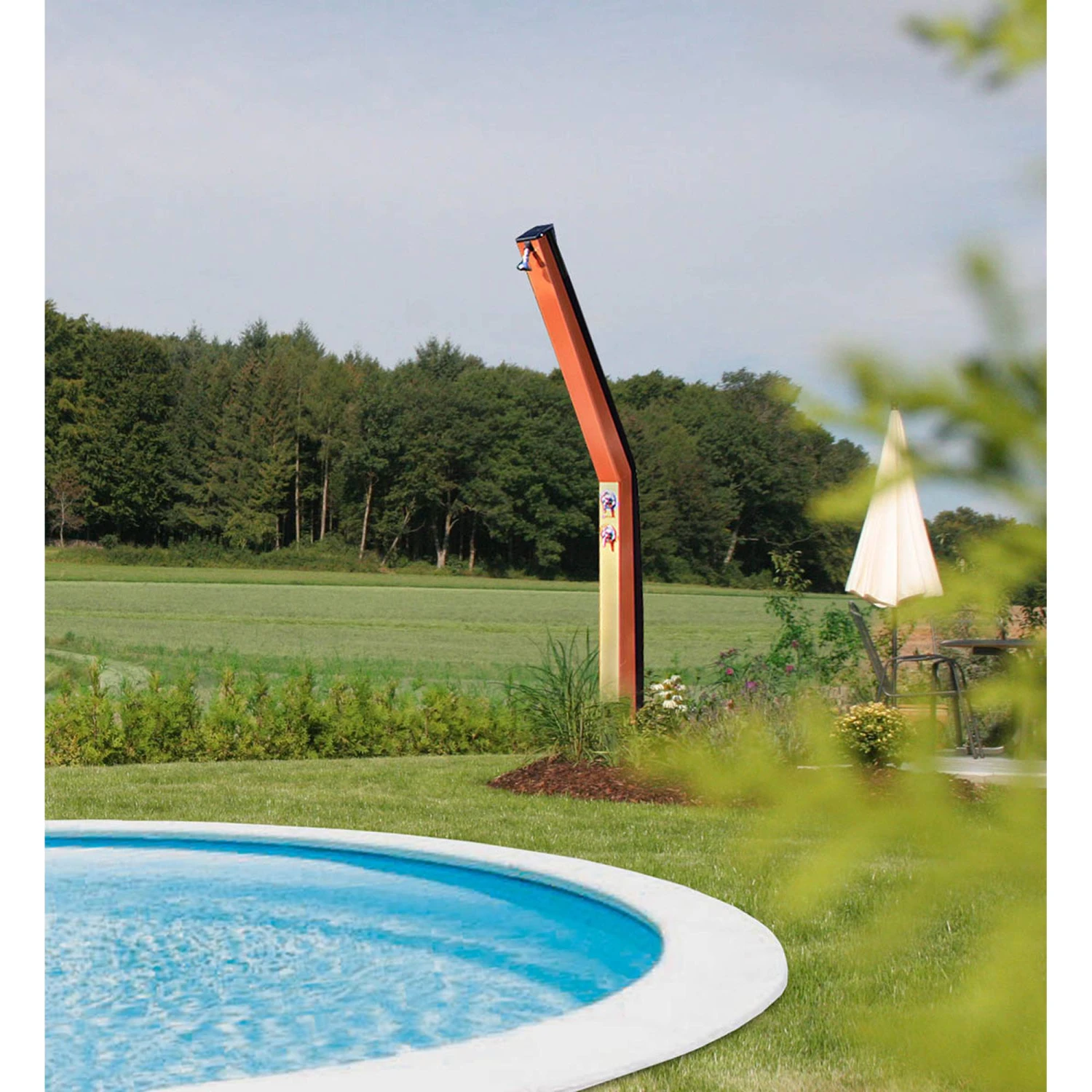 Die Dusche kann einfach an einen vorhandenen Wasseranschluss mit Hilfe des Gartenschlauchs angeschlossen werden! Der Sockel muss im Boden fest verankert werden.