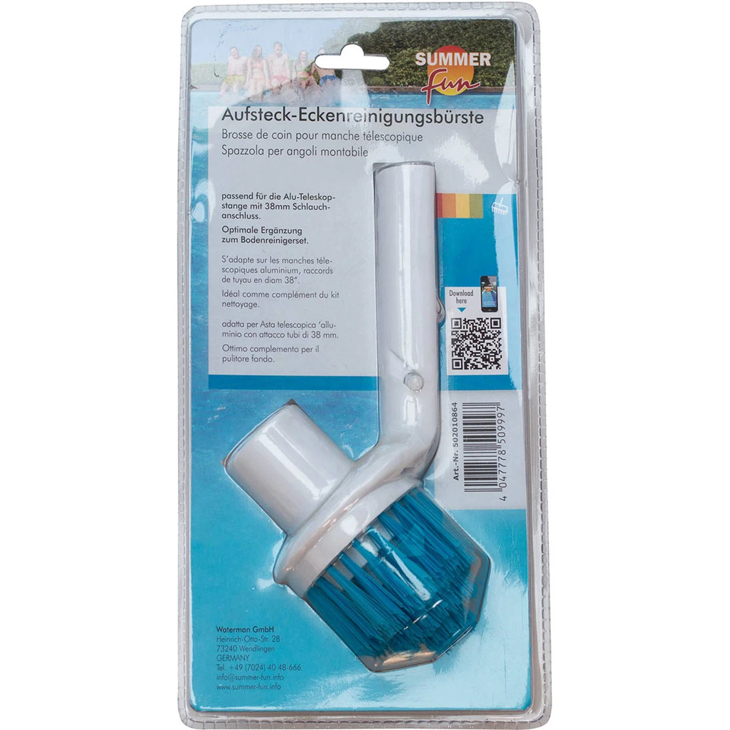 Mit der Aufsteck-Eckenreinigerbürste der Marke Summer Fun lassen sich die Ecken Ihres Pools einfach reinigen. Passend mit allen handelsüblichen Teleskopstangen mit 32 mm Durchmesser.