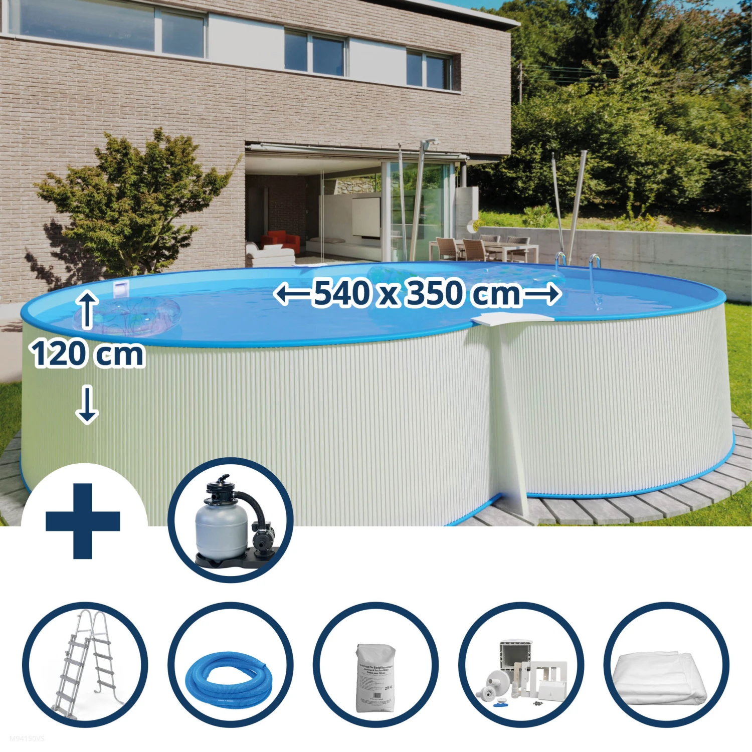 Dieser Achtformpool hat die Maße 540 x 350 x 120 cm und die Außenfarbe weiß.